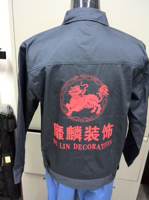 靡麟装饰此次选择的颜色较暗,与铝合金门窗材质颜色较接近,此款颜色较新颖,耐脏耐磨。胸口口袋选择的是双口袋,容量较大,拿取方便。工作服选择前后印字,印字颜色较亮,后背的麒麟图案起到了宣传和稳固企业形象的作用。