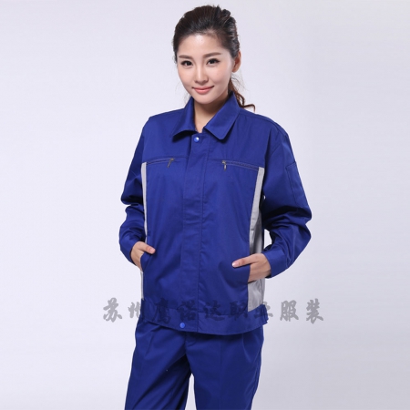苏州鹰诺服装:艳蓝配浅灰涤棉纱卡物物流库房的工作服AC072-WL