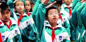 50年代,随着新中国的成立,入了少先队的学生穿白衬衫,男生蓝裤子女生蓝裙子,看上去很整齐。