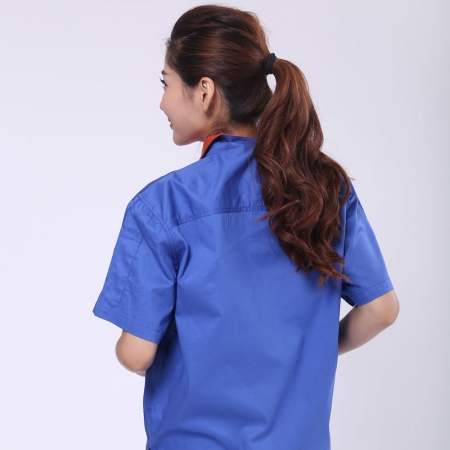 苏州鹰诺服装:深蓝配桔红短袖工作服AD069