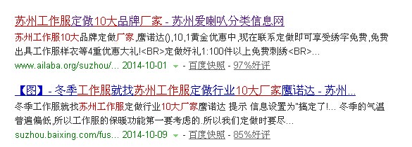 一般来说,自然搜索结果具有相对较高的权威性,前面几条一般都是收费的结果,并不具有苏州的优势。所以自然搜索的结果才具有绝对的地域优势,我想,很多朋友既然现则搜索“苏州工作服”或者“苏州工作服厂家”,那么一定是想找苏州地区的工作服厂家,百度自然结果的就是最好的地域保护,这边的厂家一般都是苏州地区的。