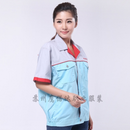 苏州鹰诺服装:深蓝配桔红短袖工作服AD069