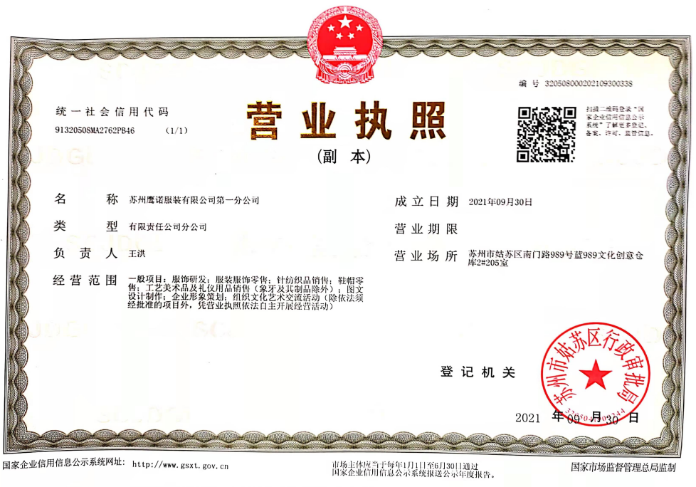 苏州鹰诺服装有限公司第一分公司资质